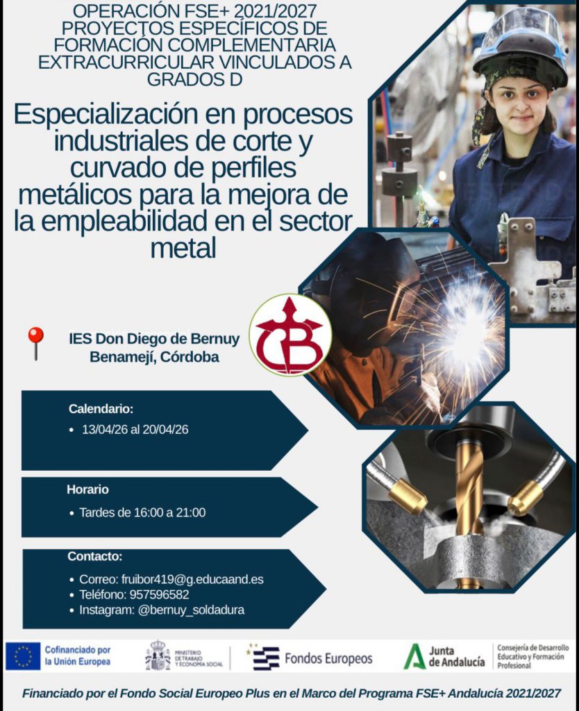 El proyecto refuerza la formación del alumnado de Soldadura y Fabricación mediante una especialización práctica en corte y curvado de perfiles metálicos con maquinaria industrial.